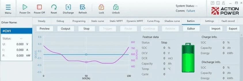 Non-linear battery reaction emulation with programmable SoC and SoH settings supported by internal resistance and multi-order RC equivalent circuits. Reproduction of realistic voltage sags, efficiency variations, transient response across operating conditions.